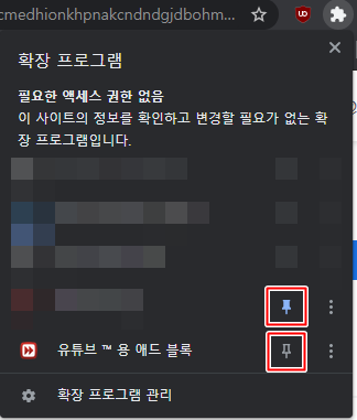 저는 유튜브 애드블록 뿐 아니라 몇 가지 다른 확장 프로그램들을 사용중이기에 목록이 꽤나 많습니다.